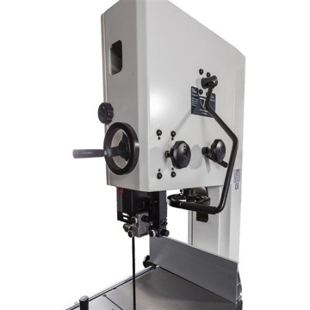 - Heavy-duty guide post adjusted via a toothed rack and handwheel for optimal saw blade support