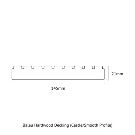 Balau Hardwood Decking in a 21mm x 145mm 2.74m cross section. Castle profile on one face, reeded on the other face.