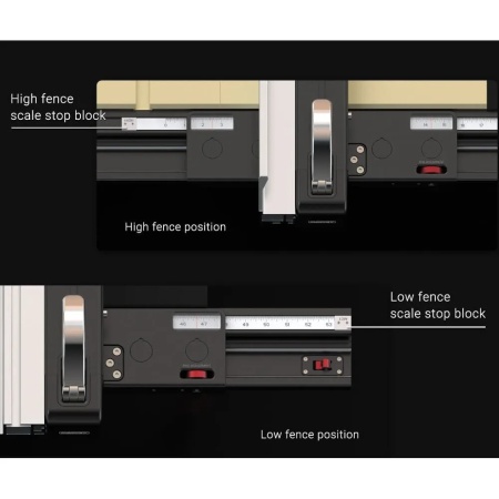 The BIG EYE Rip Fence System features a standard high/low fence plate to accommodate different wood thicknesses. The high fence is designed for cutting thick wood, while the low fence is suitable for thin wood.
