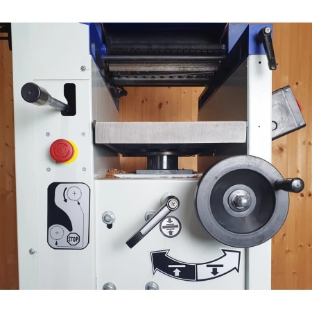 Setting the thicknessing depth is done by rotating the cast iron handwheel (1 rotation = 2mm) and reading from the mechanical digital display, accurate to 1/10th of a millimetre. A position lock is fitted which prevents any movement.