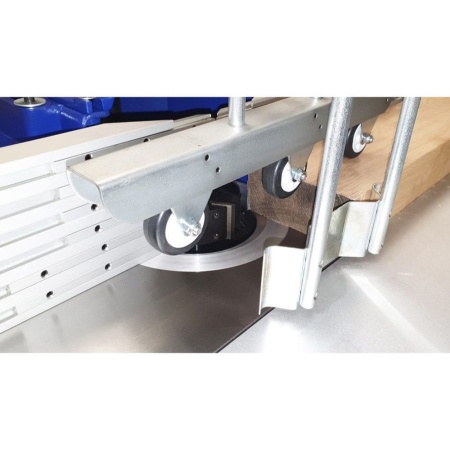 W050ET: The optional outrigger table with telescopic support arm is ideal for those working with larger panels or longer lengths of timber. A squaring arm can be set to any angle and has a flip-over sliding length stop graduated in millimetres up to 1500mm.
