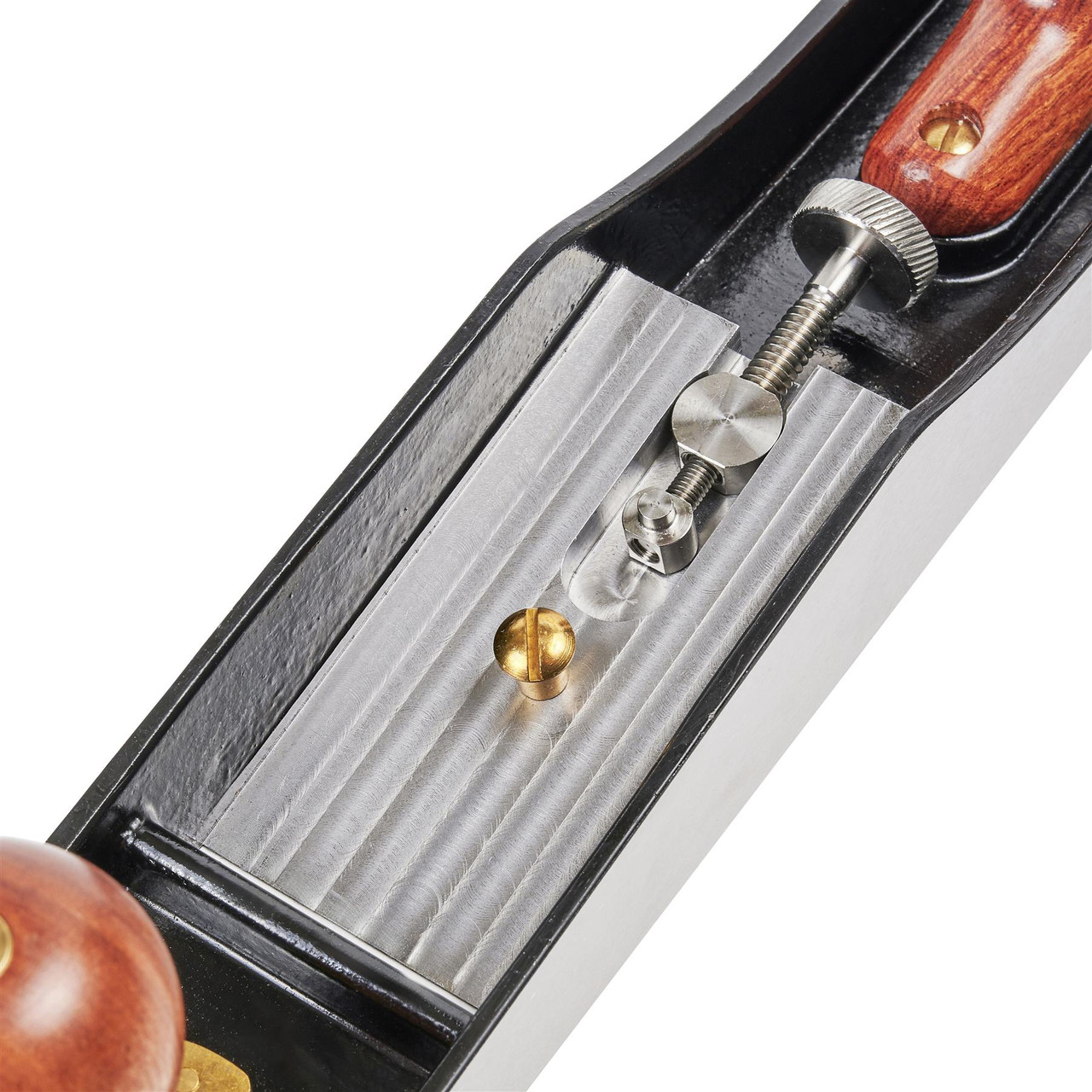 The plane mouth is fully adjustable. Untighten the front handle knob to release the toe and then adjust the mouth using the lever.