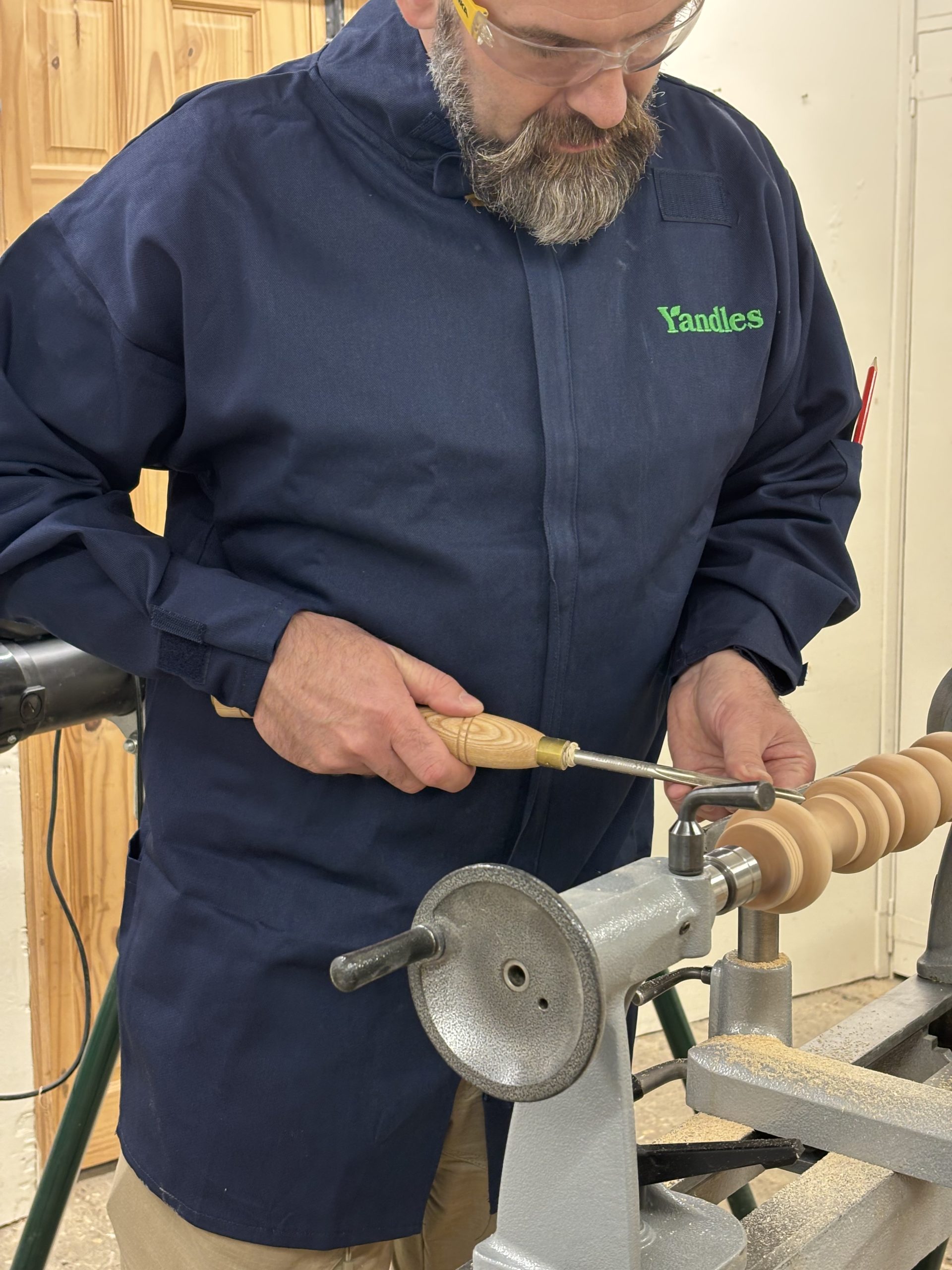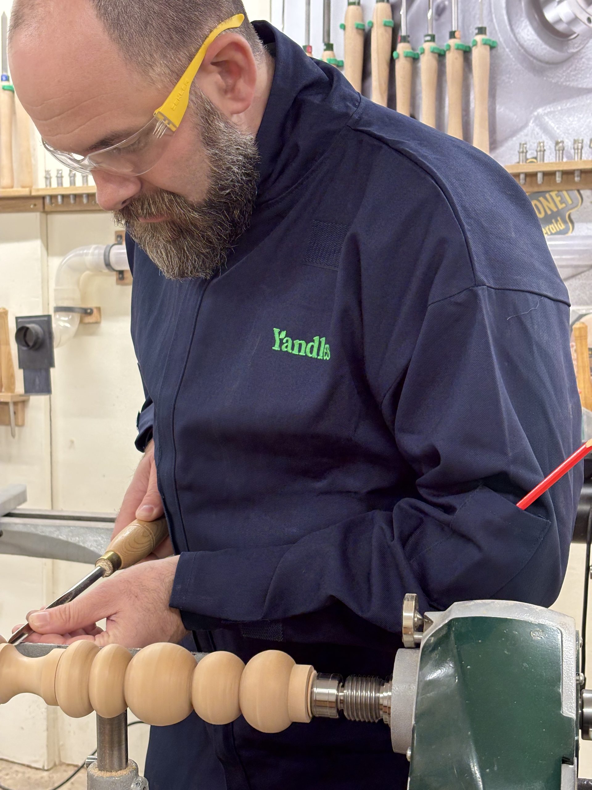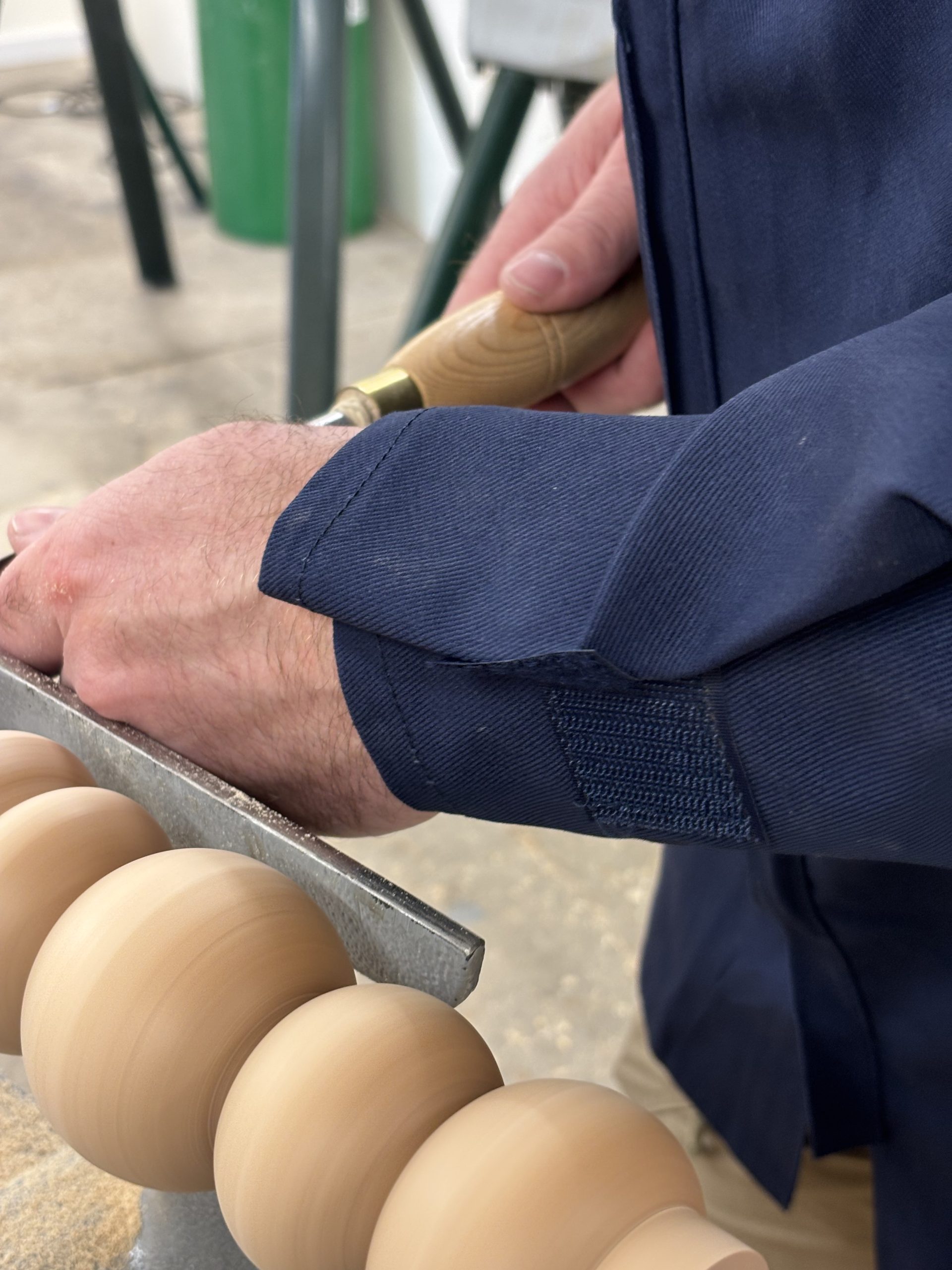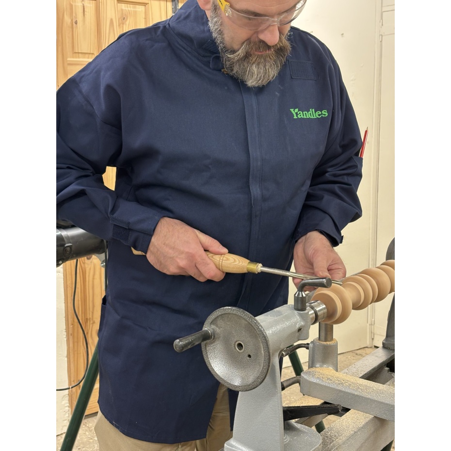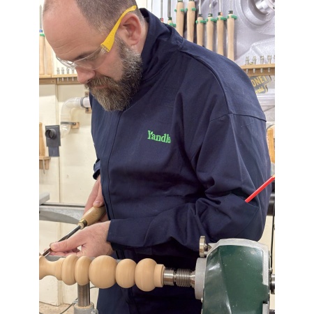 A woodturning smock is best for keeping your clothes clean while turning and minimising shavings being carried into the home!